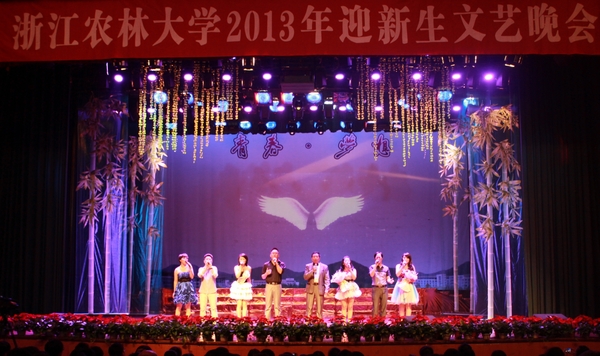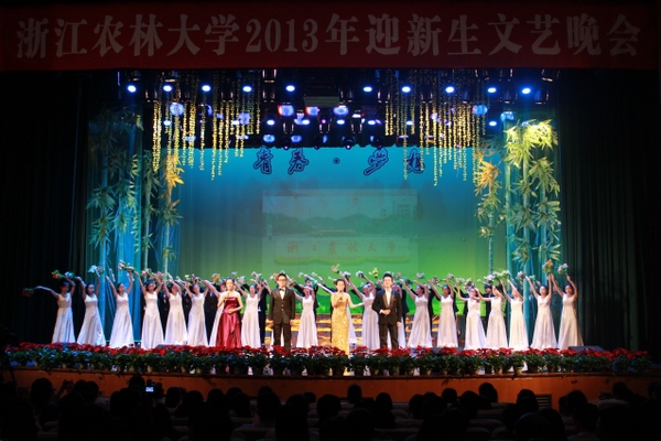 在一段包含校園風光、夢想暢談、真切寄語的視頻后,晚會拉開帷幕。開場舞《給力青春》率先將現場氣氛點燃,動感的舞步洋溢著青春的風采。各學院新生代表閃亮登場,高高揚起的旗幟,錚錚吶喊的誓言,一展新生昂揚自信的精神風貌。感人肺腑的歌曲《父親》,伴著迎新時父母接送新生的身影,使全場沉浸在濃濃的親情氛圍中。“……夢想是帆,漲滿希望之風;夢想是風,吹開希望之花;夢想是花,開出浙農林大學子最美好的青春年華。”詩朗誦《我的大學夢》,共話浙農林大新生美好而真摯的夢想。律動輕快的快板《學生手冊》告訴新生們作為一名農林大在校學生應該掌握的“應知應會”。舞臺劇《昨日重現》則以學長們的成長經歷從多角度展現了浙農林大學子的校園生活,給新生們啟迪良多。由2013級新生黃卓藝帶來的震撼人心的琵琶獨奏《十面埋伏》將晚會推向高潮。最后,晚會在一曲氣勢恢宏的大型歌舞《我的中國夢》中圓滿落幕。