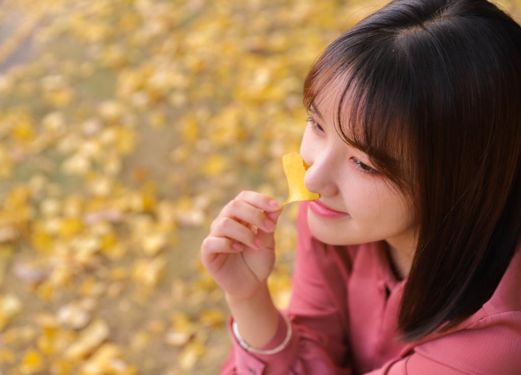 一枚杏葉搭在肩上,