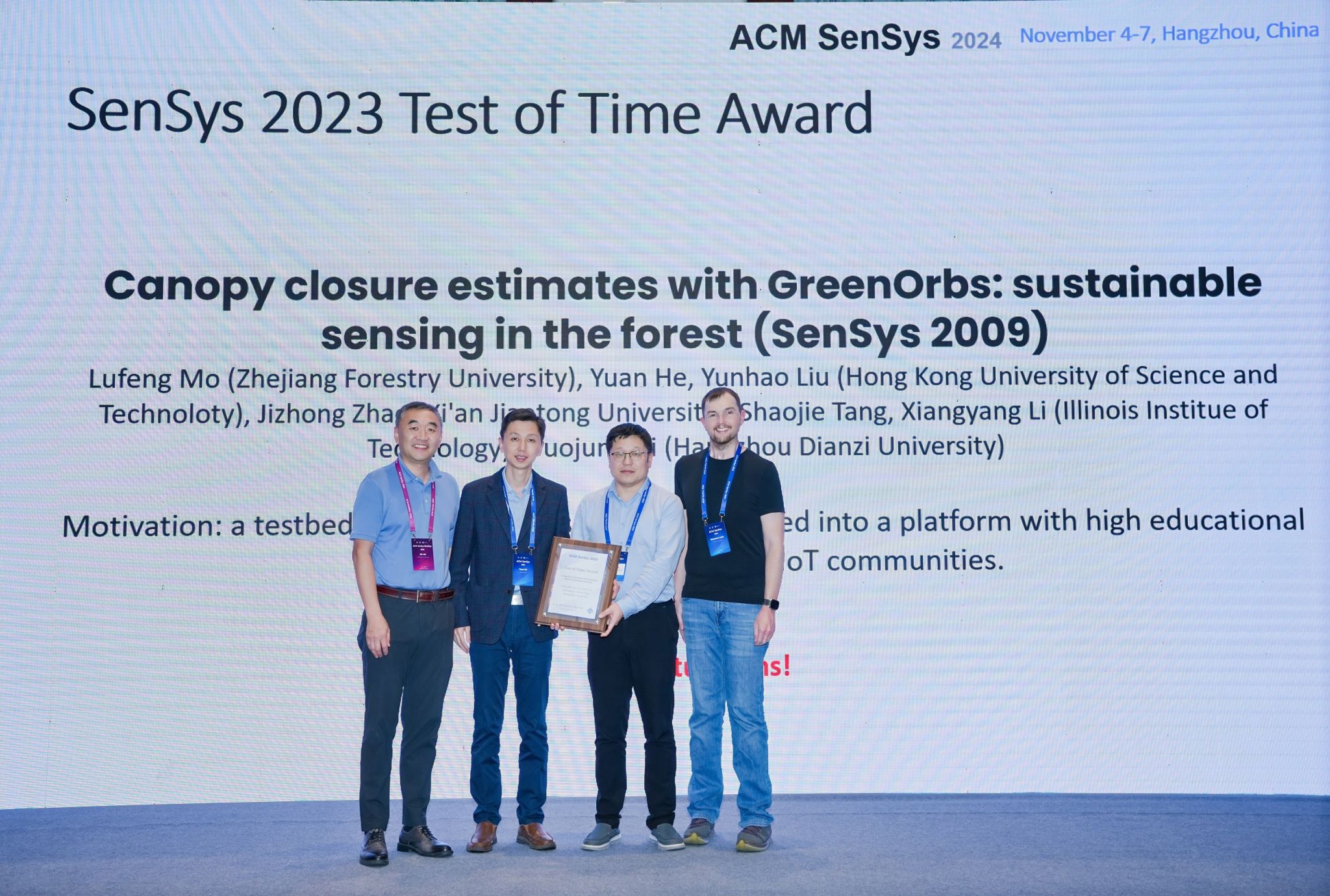 近日,由我校莫路鋒老師和香港科技大學、西安交通大學、伊利諾伊理工學院、杭州電子科技大學研究人員聯合署名,發表在The 7th ACM Conference on Embedded Networked Sensor Systems (SenSys 2009)上的論文《Canopy Closure Estimates with GreenOrbs: Sustainable Sensing in the Forest》(《利用GreenOrbs進行林冠郁閉度估算:森林中的可持續監測》)獲得ACM SenSys 2023 經久不衰獎(Test of Time Award)。