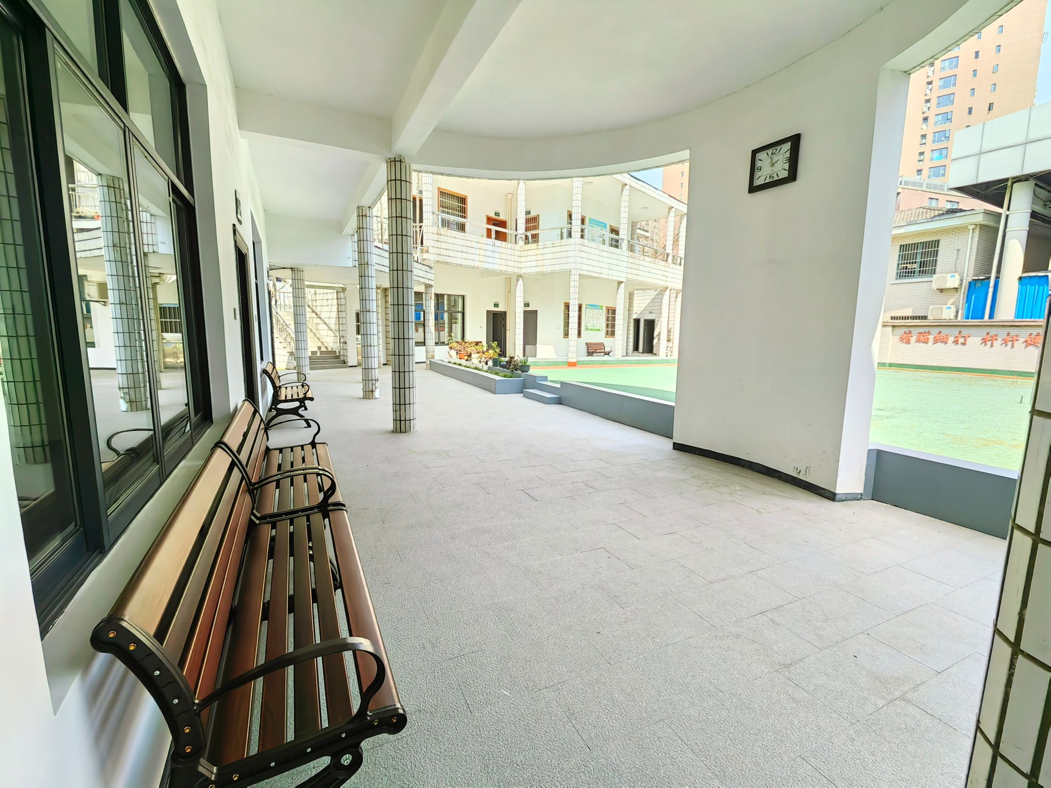 原活動中心因年代久遠,存在門窗破損、地面坍陷、樓梯陳舊、戶外椅損壞、走廊照明不足等問題,影響老同志們的日常活動體驗。學校高度重視,立足實際需求,以實用、簡潔、安全為基本要求,對基礎設施進行全面升級:更換全部老舊門窗,加裝洗手間及樓梯安全扶手,戶外樓梯增設防雨棚,地面進行防滑處理,戶外休閑椅和樓道吸頂燈全部換新。改造后的活動中心各功能室整潔明亮,細節(jié)處處體現(xiàn)適老化設計,安全性與舒適性顯著提升。
