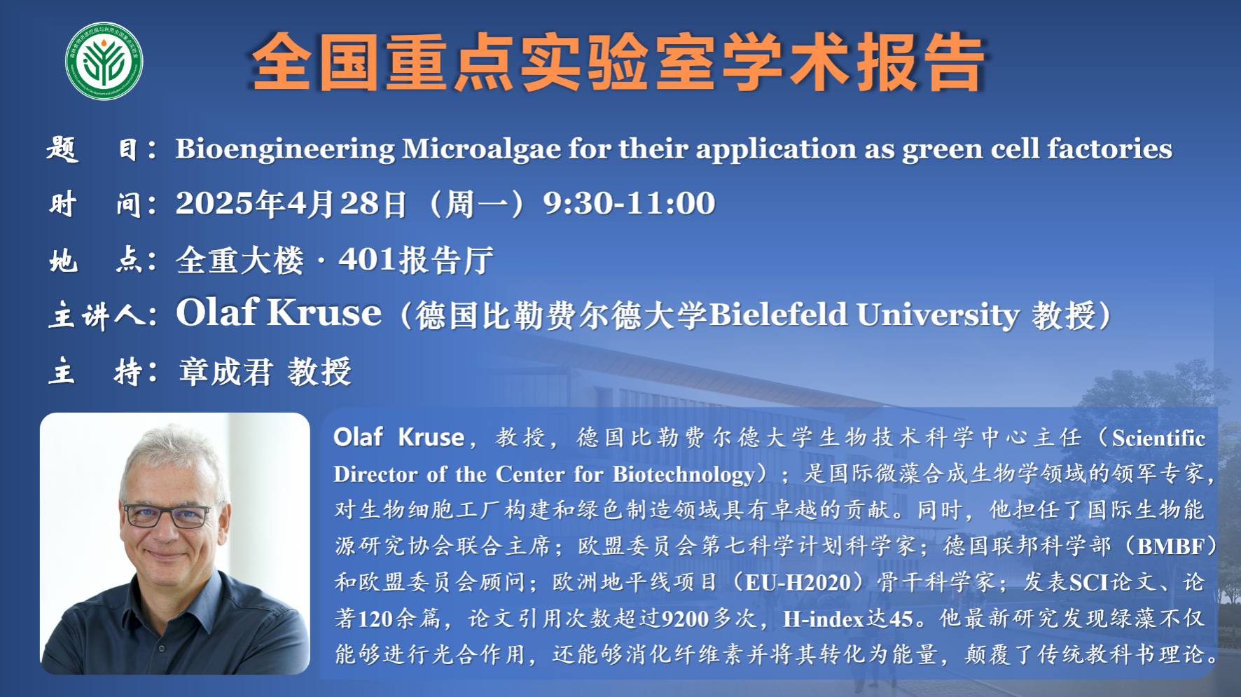 講座預(yù)告:Bioengineering Microalgae for their application as green cell factories