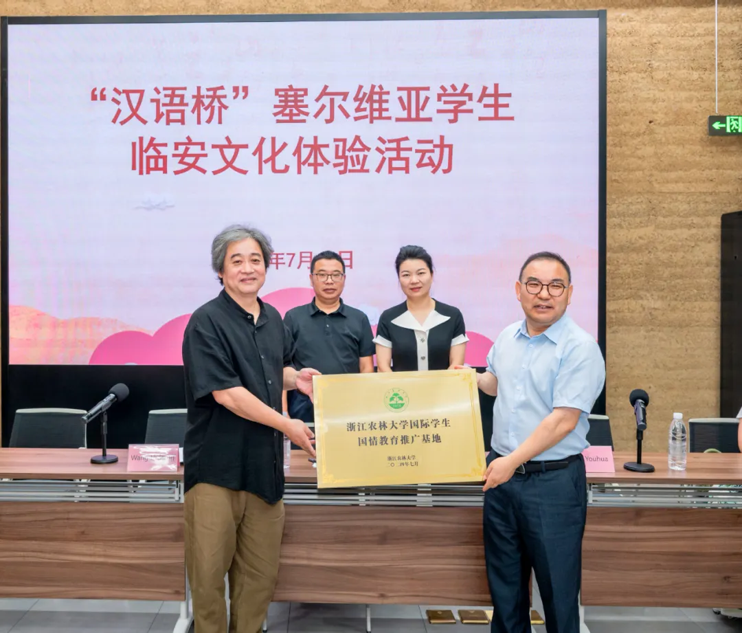 國教學院院長趙有華對臨安區文聯推動中塞文化交流所作出的努力表示感謝,并提出今后將充分發揮國際生的獨特作用,更好地把吳越文化和臨安向世界各地進行推介。趙有華給臨安美術館授予“浙江農林大學國際學生國情教育推廣基地”的牌匾。